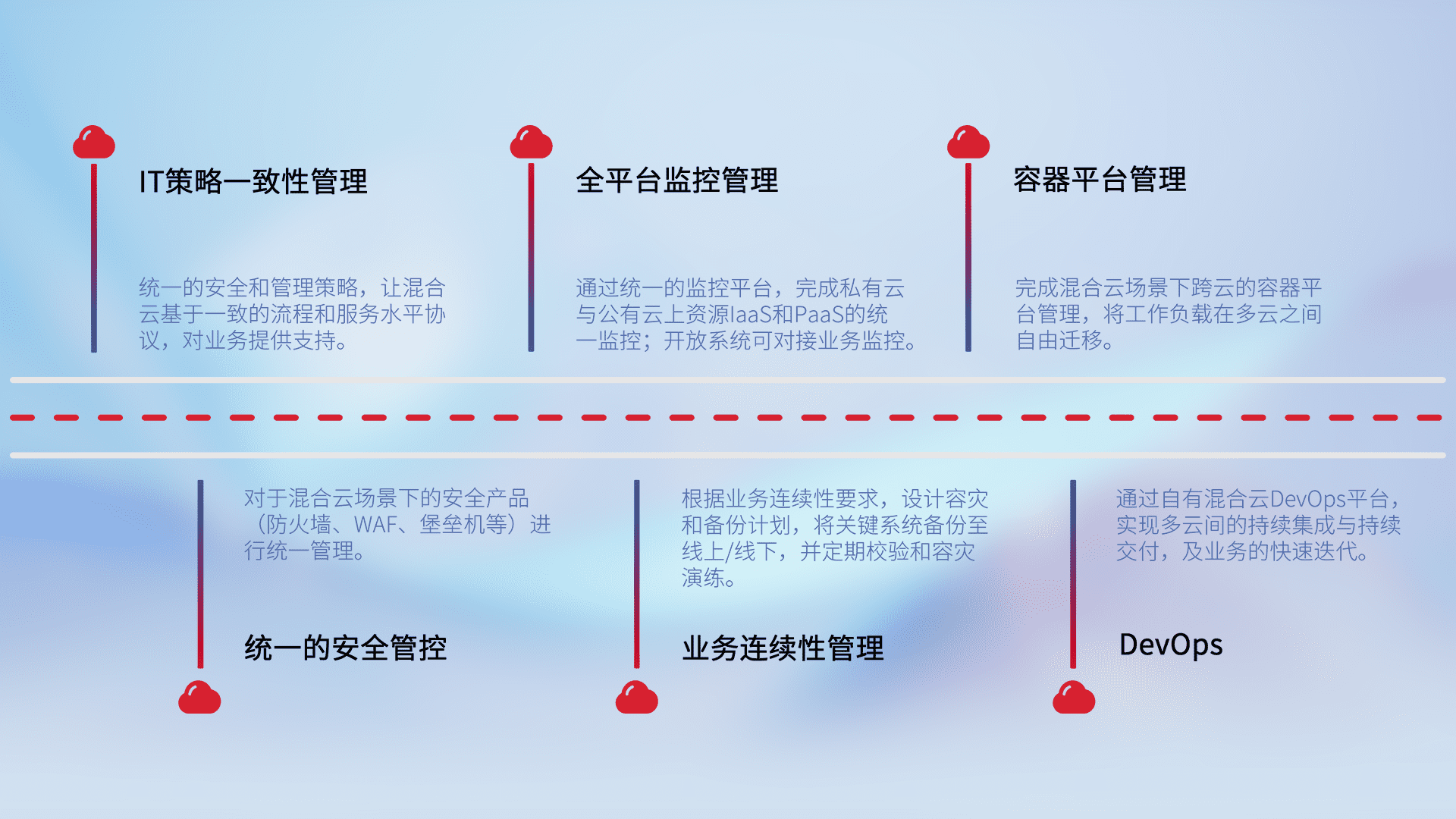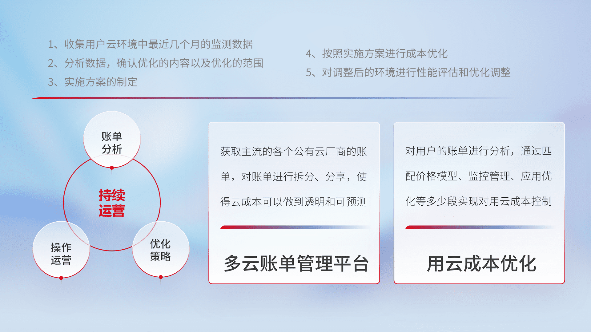 通过多云纳管,,,,以统一的资源数据模型把客户的云资源进行抽象和封装,,,,进而实现对多云资源的统一操作,,保障云资源管理的可靠性、、稳定性与可用性。。。量身定制化运维内容,,配置、、、、开发运维、、、、补丁管理、、、、备份、、、监控、、认证和访问管理、、、审计和日常巡检等,,保障在用云过程中的可靠度,,,,稳定度以及高可用率。。。。