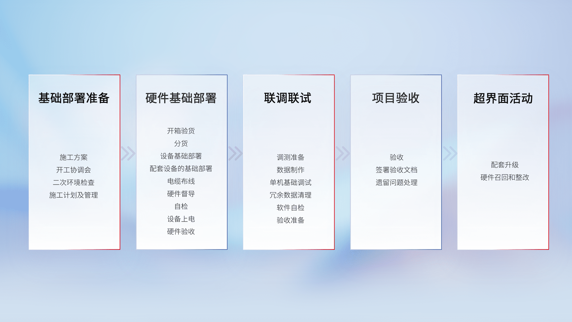 从基础部署准备、、硬件基础部署、、联调联试、、、、项目验收、、、、越界面活动的全过程可追溯,,保证施工质量和进度。。。